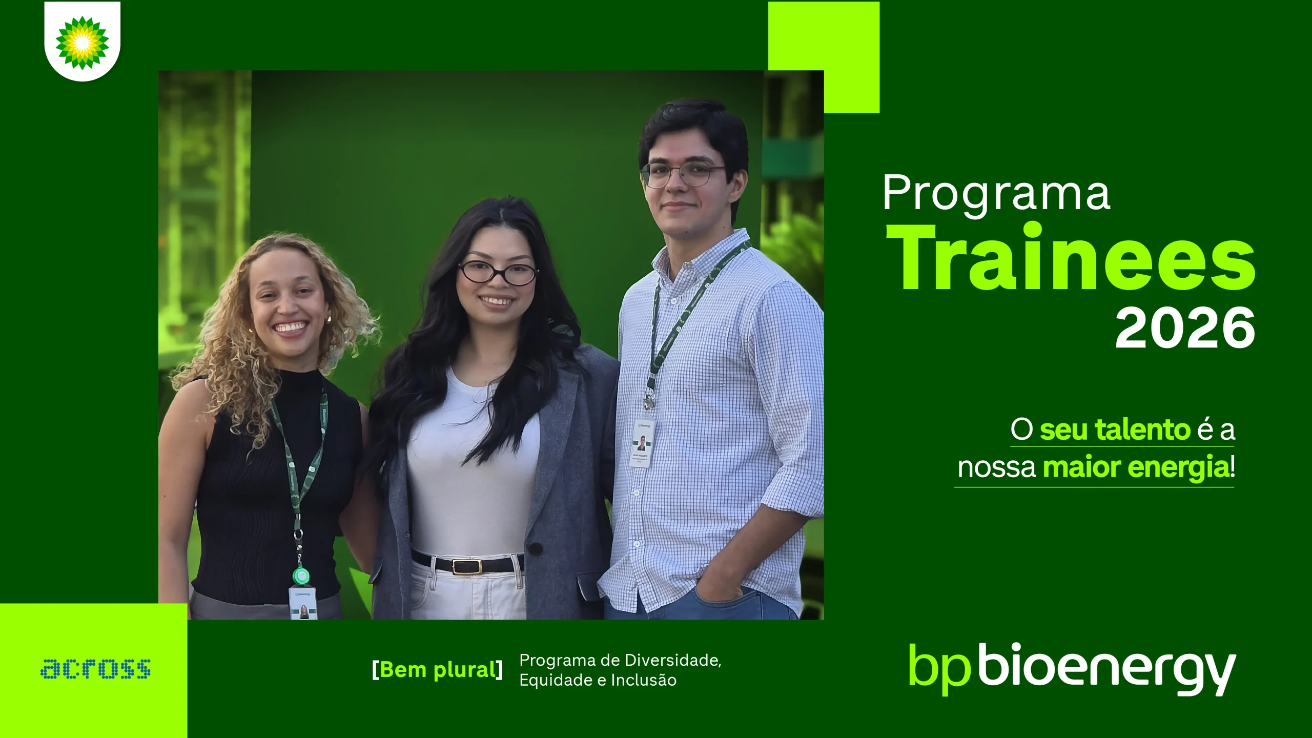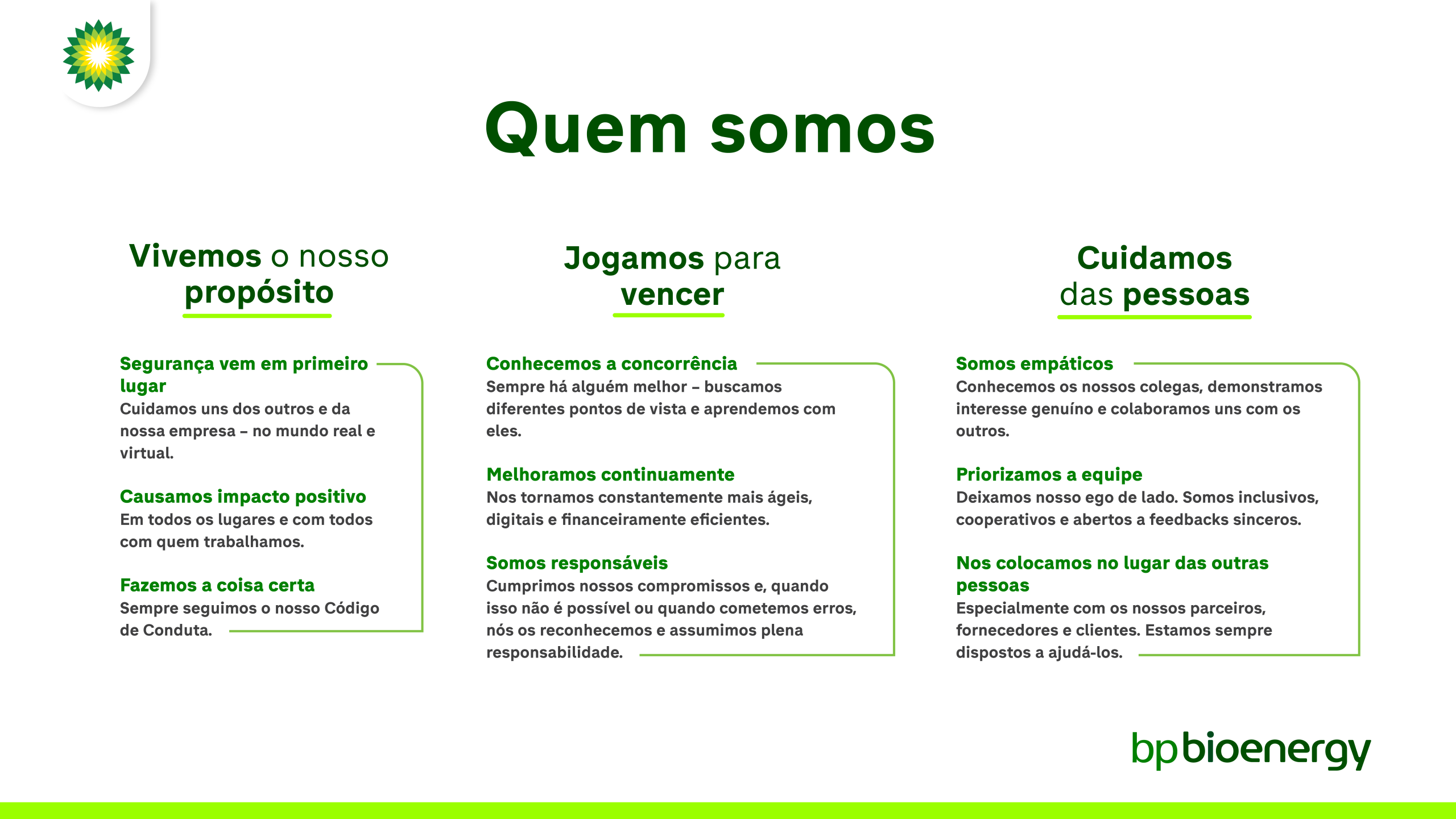 Para a bp bioenergy, o respeito pela Diversidade é a energia que move o mundo. Afinal, independente de gênero, raça, etnia, orientação sexual, deficiência ou geração, o que nós buscamos são diferentes experiências e perspectivas para agregar ao nosso time. Traga sua bagagem e sua história para crescermos juntos!